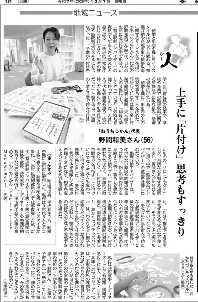 NPO法人ひと・コネクト兵庫の理事を務める野間和美さんが、2025年12月7日付の産経新聞・地域ニュース「人」コーナーにて、その多岐にわたる活動と独自の哲学について大きく紹介されました。