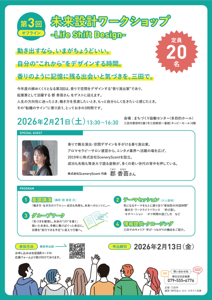 スペシャルゲスト 郡 香苗(こおり かなえ)さん 日時 : 2026年2月21日(土) 13:30~16:30 会場 : まちづくり協働センター(多目的ホール) 三田市駅前町2番1号三田駅前一番館(キッピーモール)6階 ゲストトーク/ふりかえり/地域企業とのトークセッション...